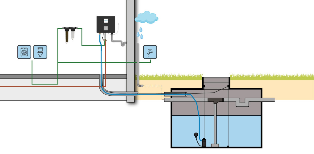 Ons regenwatersysteem PRO is geschikt voor vrijstaande woningen en kleine bedrijven. Dit systeem is als volgt opgebouwd: