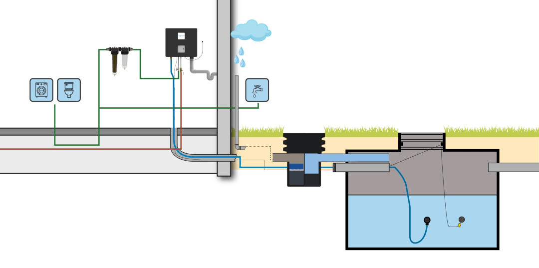 De first flush van het regenwater neemt de vervuiling van dak- en dakgoten mee en stroomt altijd door de drie filters. Dat geldt ook voor rustige buien met een laag watervolume. Bij hevige buien met een hoge watervolume zal het regenwater over de filters en het tussenschot heen stromen, de vervuiling is dan echter al gevangen door de drie filters.
