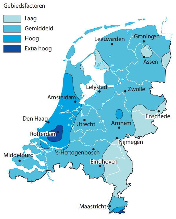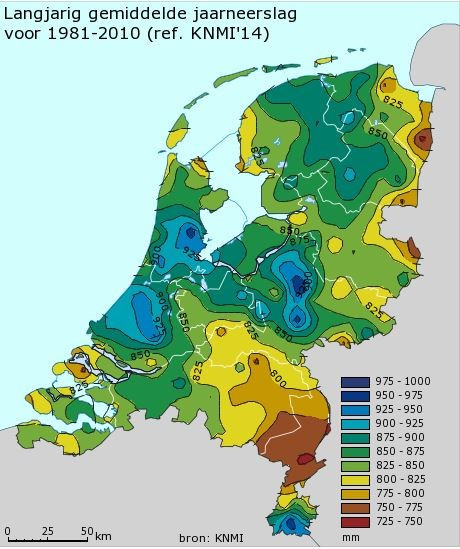 In Nederland valt gemiddeld 880 mm regen per jaar. Dat verschilt echter sterk per regio (zie bijgaand figuur, bron: KNMI) en per seizoen. In het najaar valt er meer regen aan de kust en in het voorjaar meer landinwaarts.